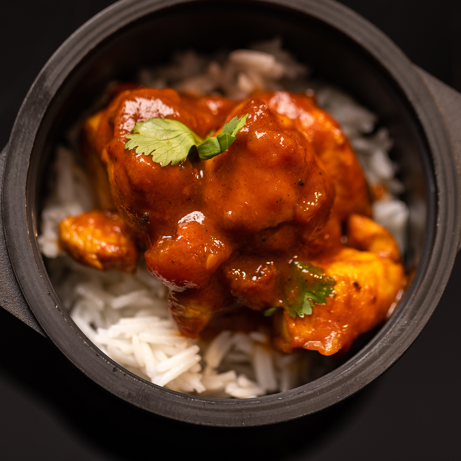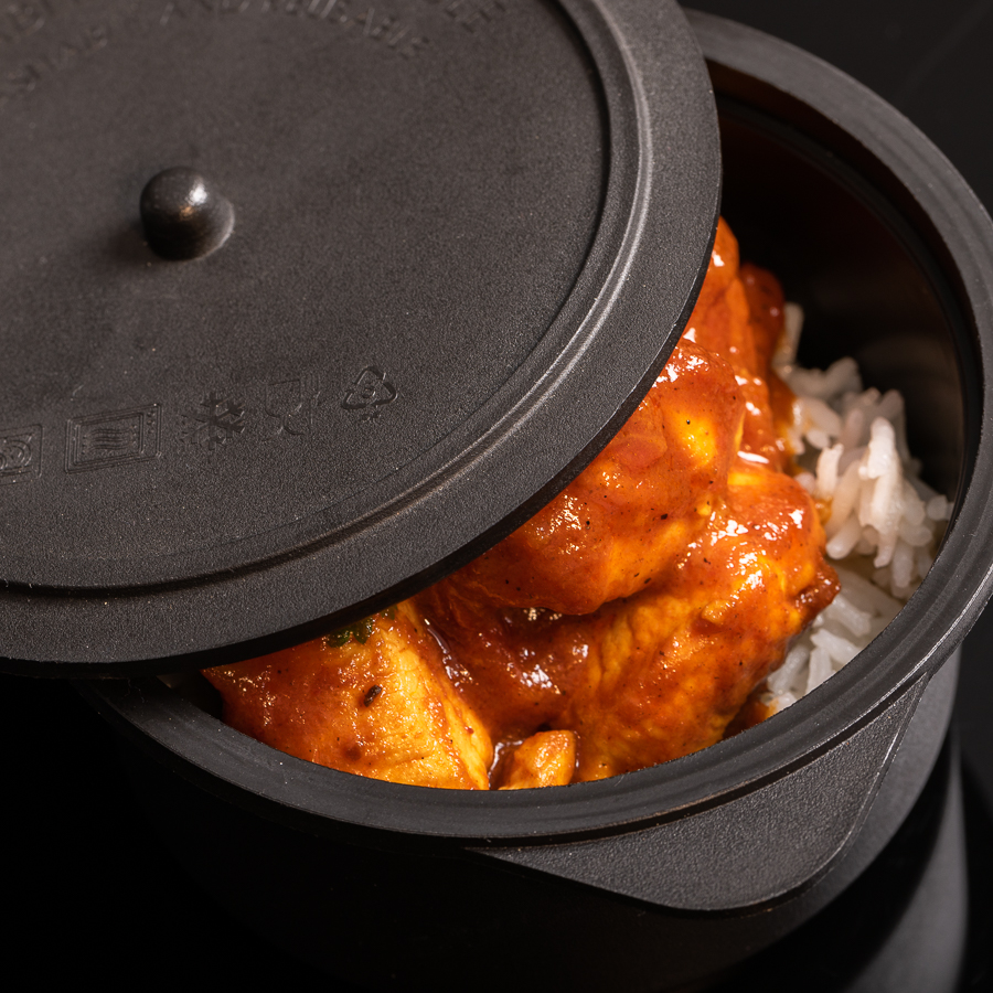Un plato típico de la India. El Tikka Masala es un Curry cremoso a base de tomates y especias. Lo acompañamos de arroz basmati y perejil. Una porción generosa de grandes cubos de pollo cocinado a la perfección logrará grandes sorpresas en tus invitados.