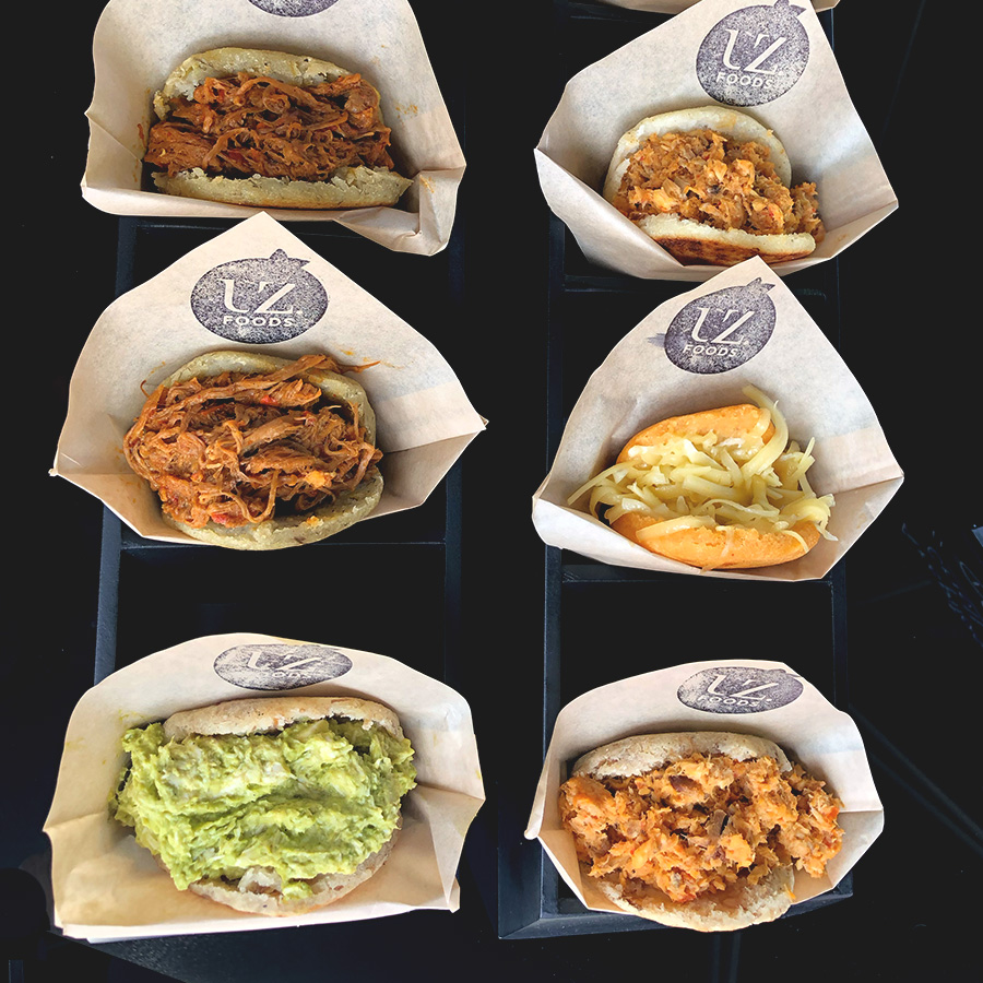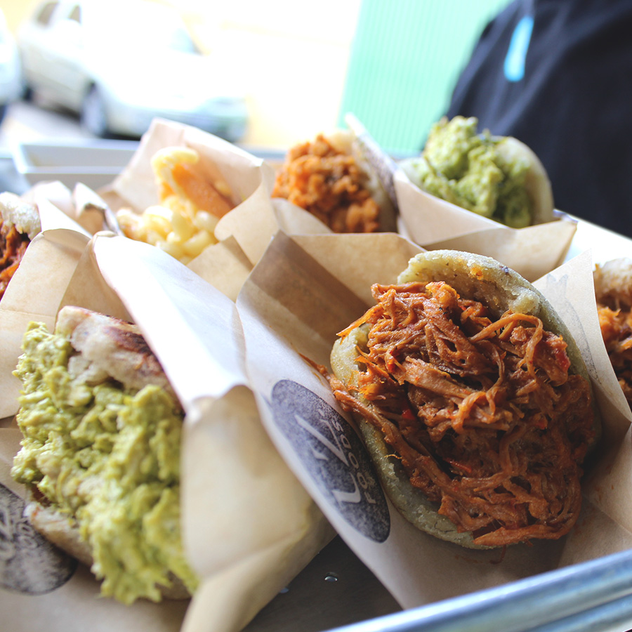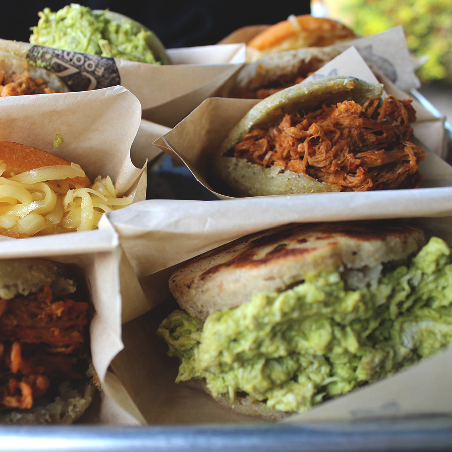 Arepitas de ají dulce, plátano, chicharrón y clásica. Rellenas de reina pepiada, carne mechada, queso, caraotas y pisillo de pescado.