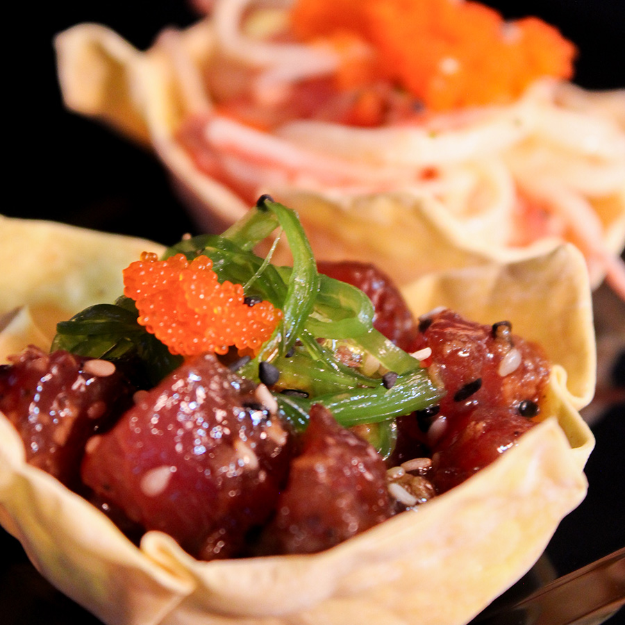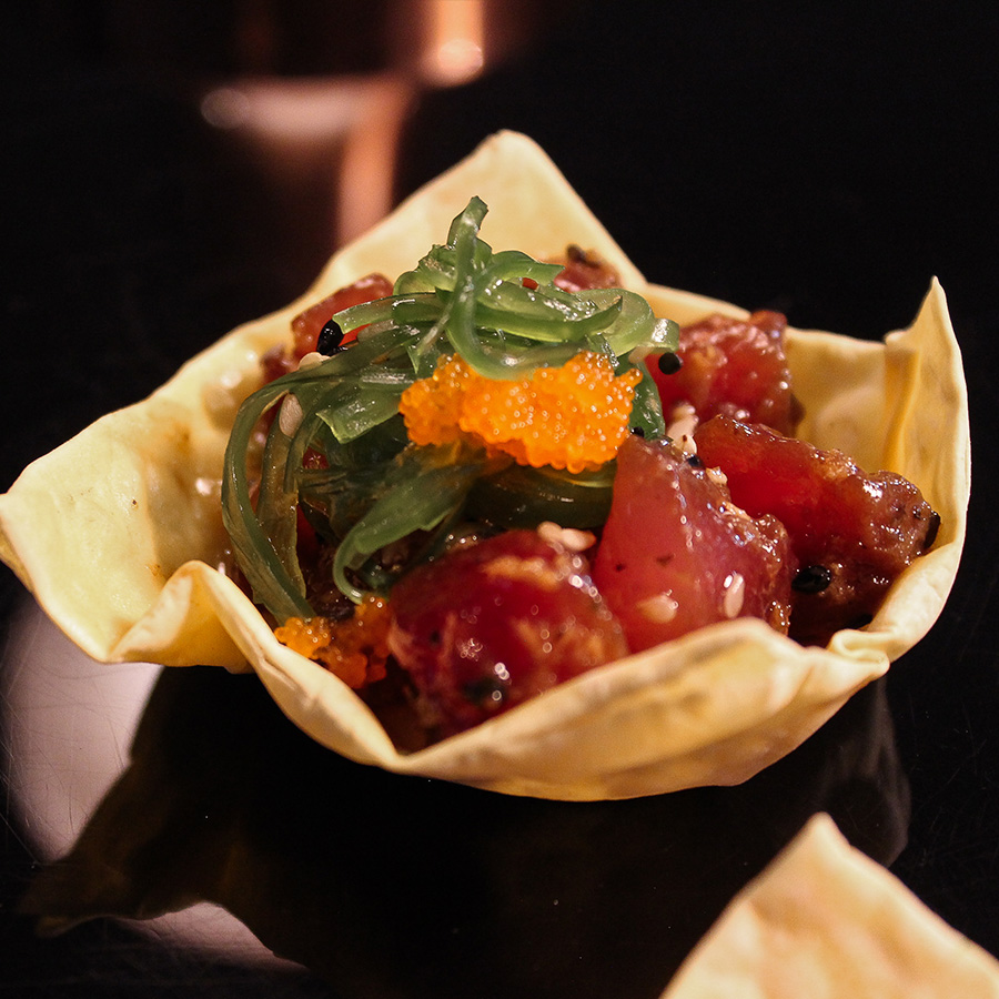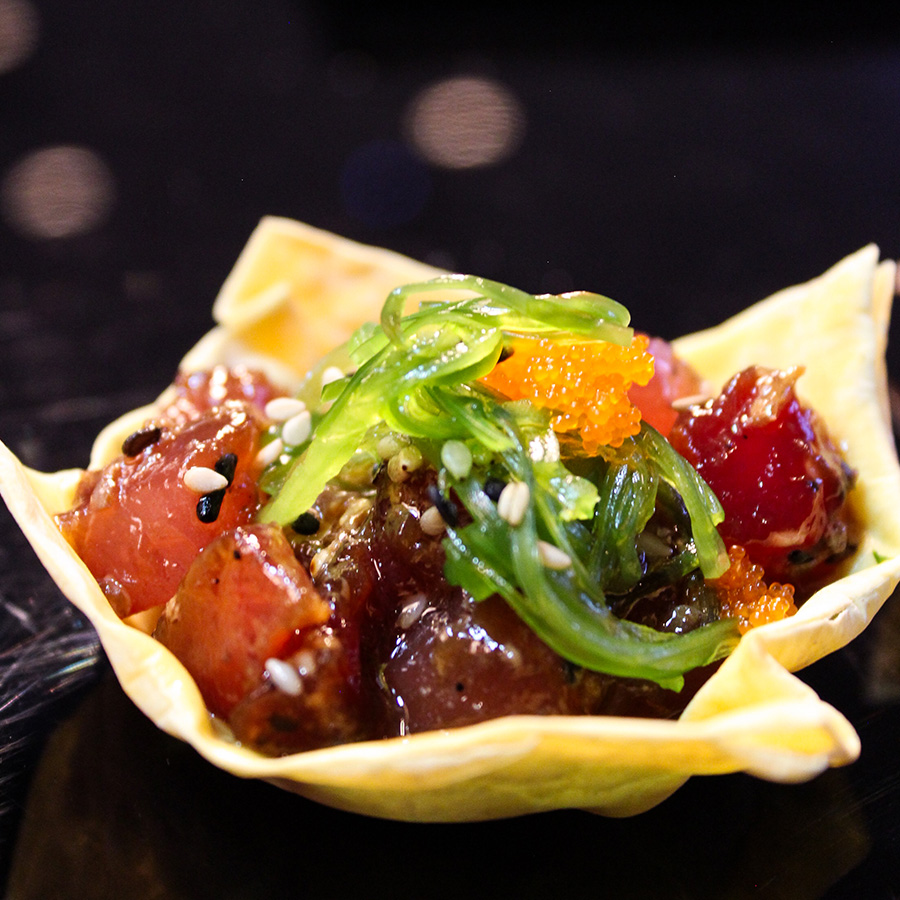 Tuna tartar, masago y wakame servidos sobre una cesta de wanton crujiente al horno para disfrutar sus texturas.