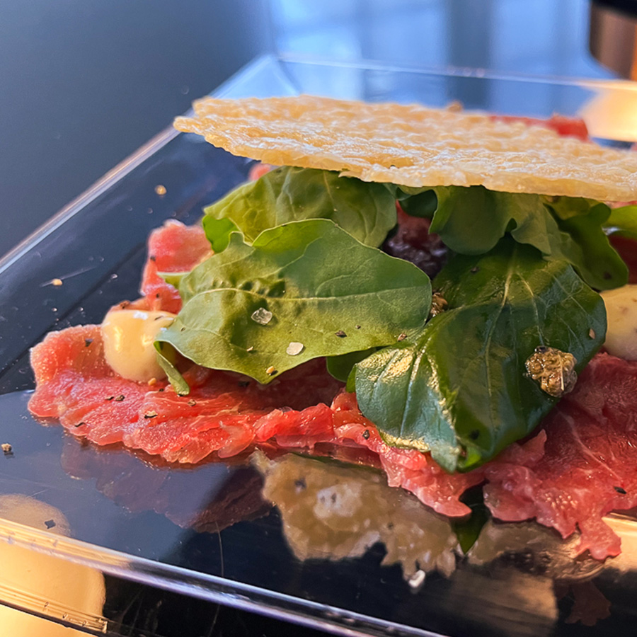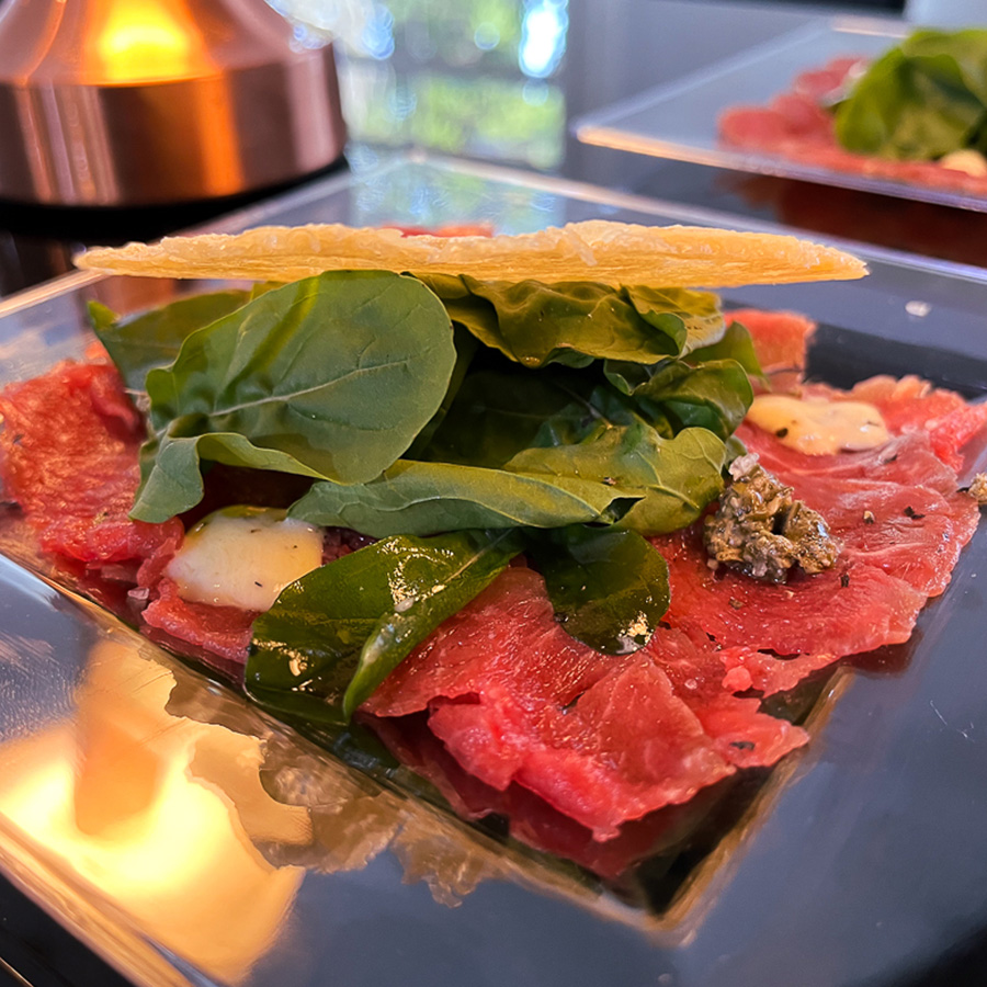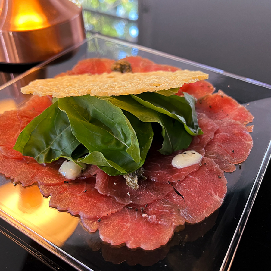 Carpaccio de Lomito con crujiente de 100% queso Grana Padano, acompañado de rúgula, aioli trufado y pesto de albahaca.