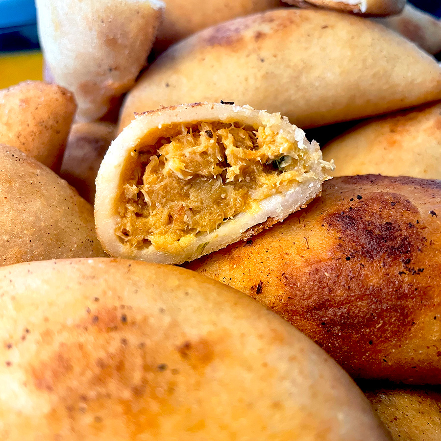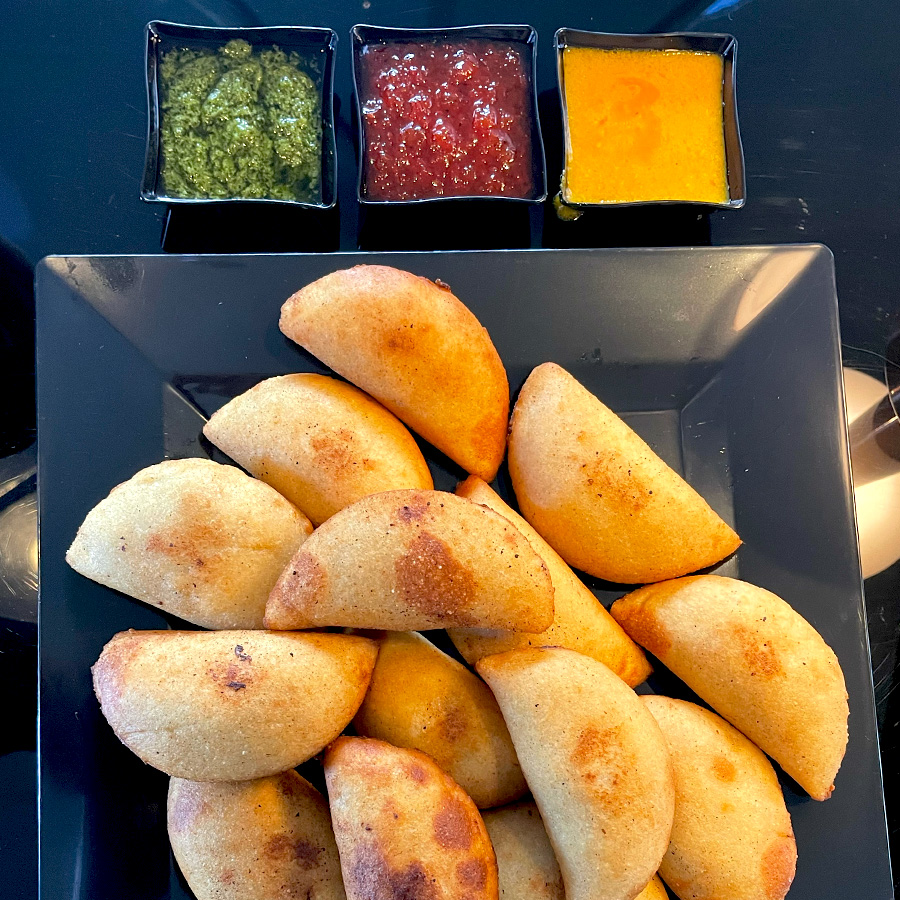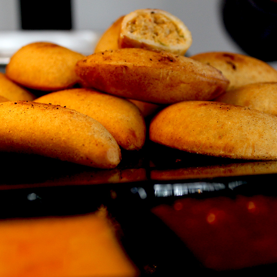 Ración de 2 UND de Empanaditas de pisillo de pargo rojo para compartir. Acompañadas de 3 salsas: Picante Amarillo UZ, Confítura de Ají Dulce y Aceite de Cilantro.