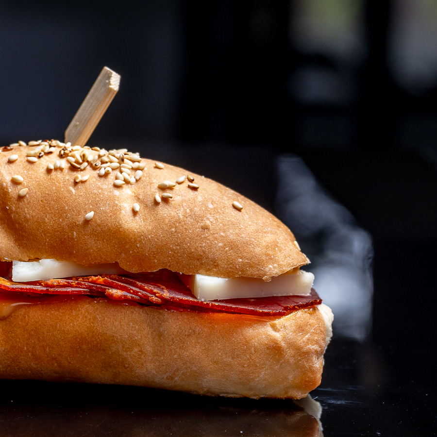 Panini UZ Lomo y Manchego. Pan baguette, lomo embuchado, queso manchego y aioli de piquillo. Popular en: celebraciones Recomendado como: abrebocas