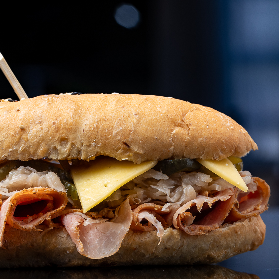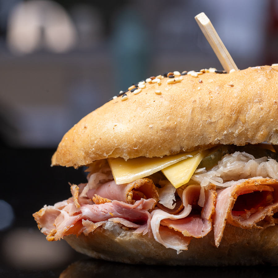 Panini UZ New York Pastrami. Pan de centeno, pastrami, sauerkraut, pepinillos, queso amarillo y mostaza de cebolla. Popular en: celebraciones Recomendado como: abrebocas