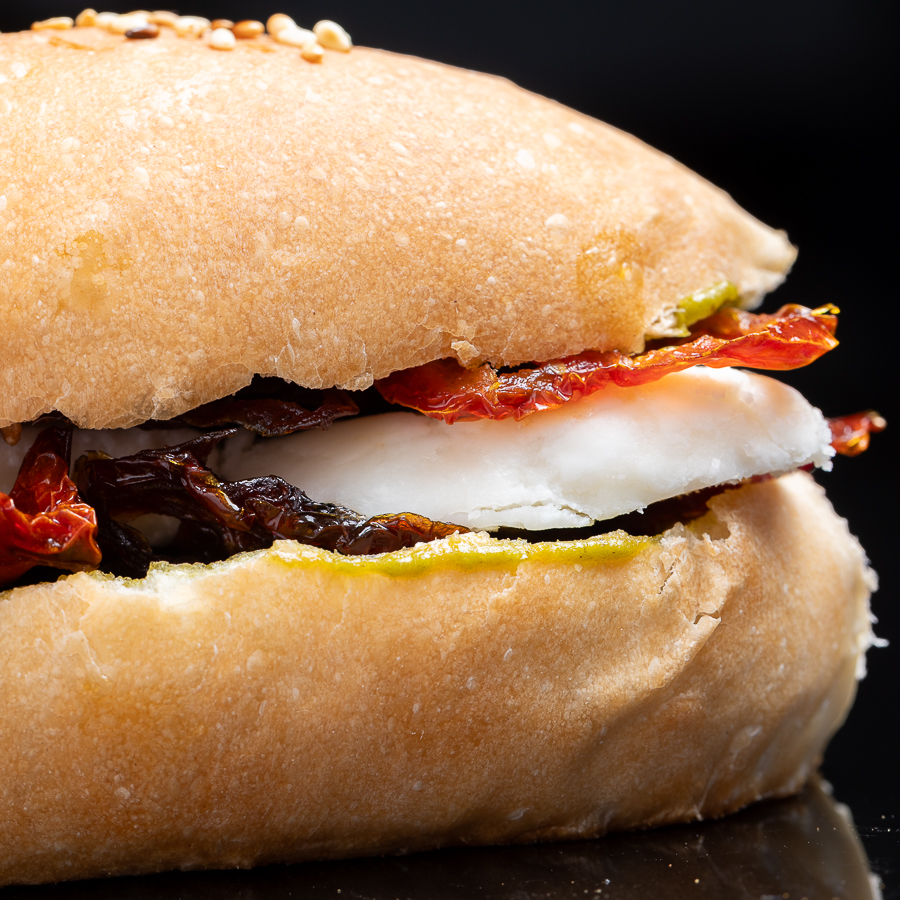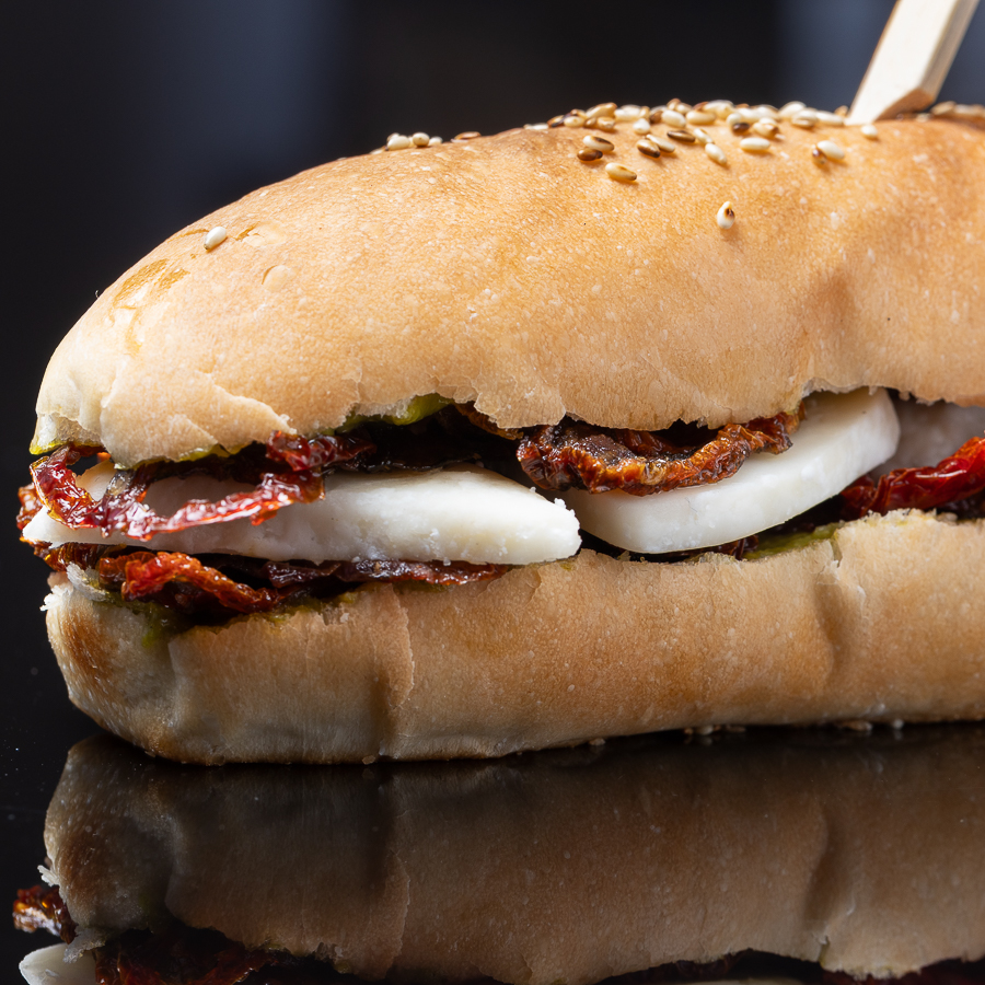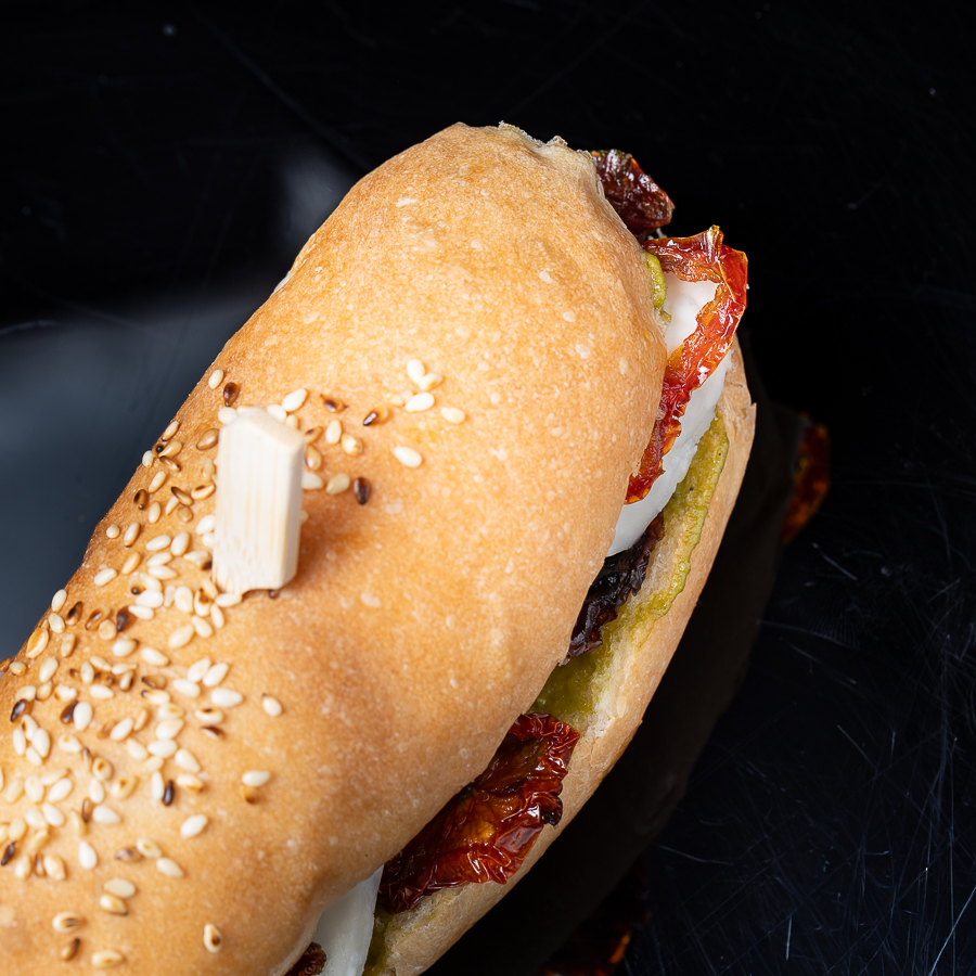 Panini UZ Capresso. Pan baguette, aioli de pesto de albahaca, tomates secos y queso gouda blanco. Popular en: celebraciones Recomendado como: abrebocas