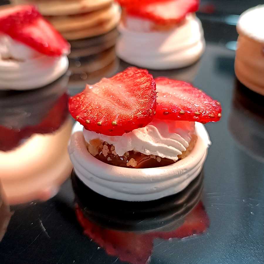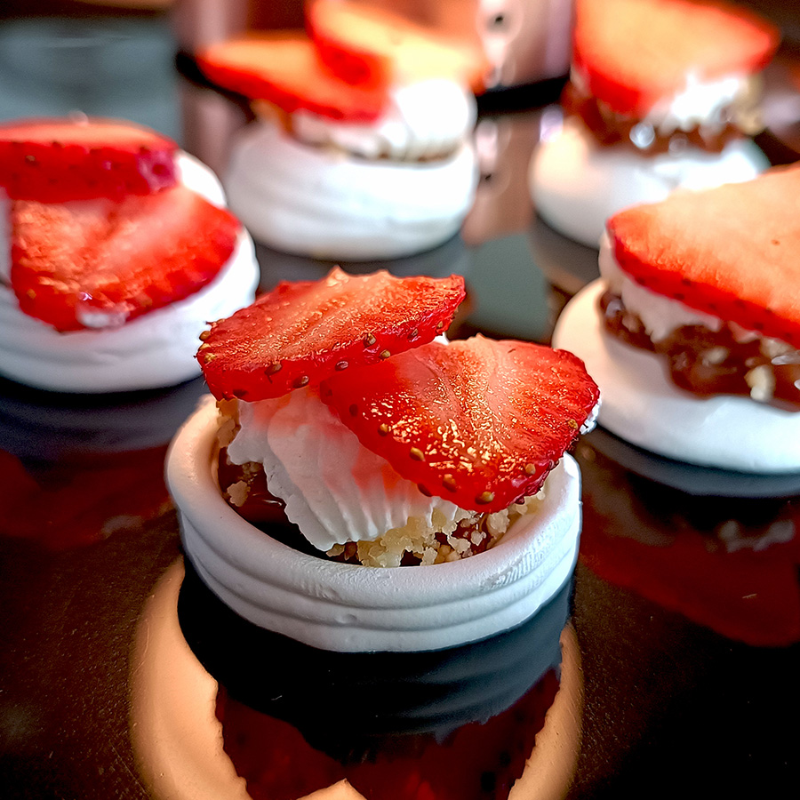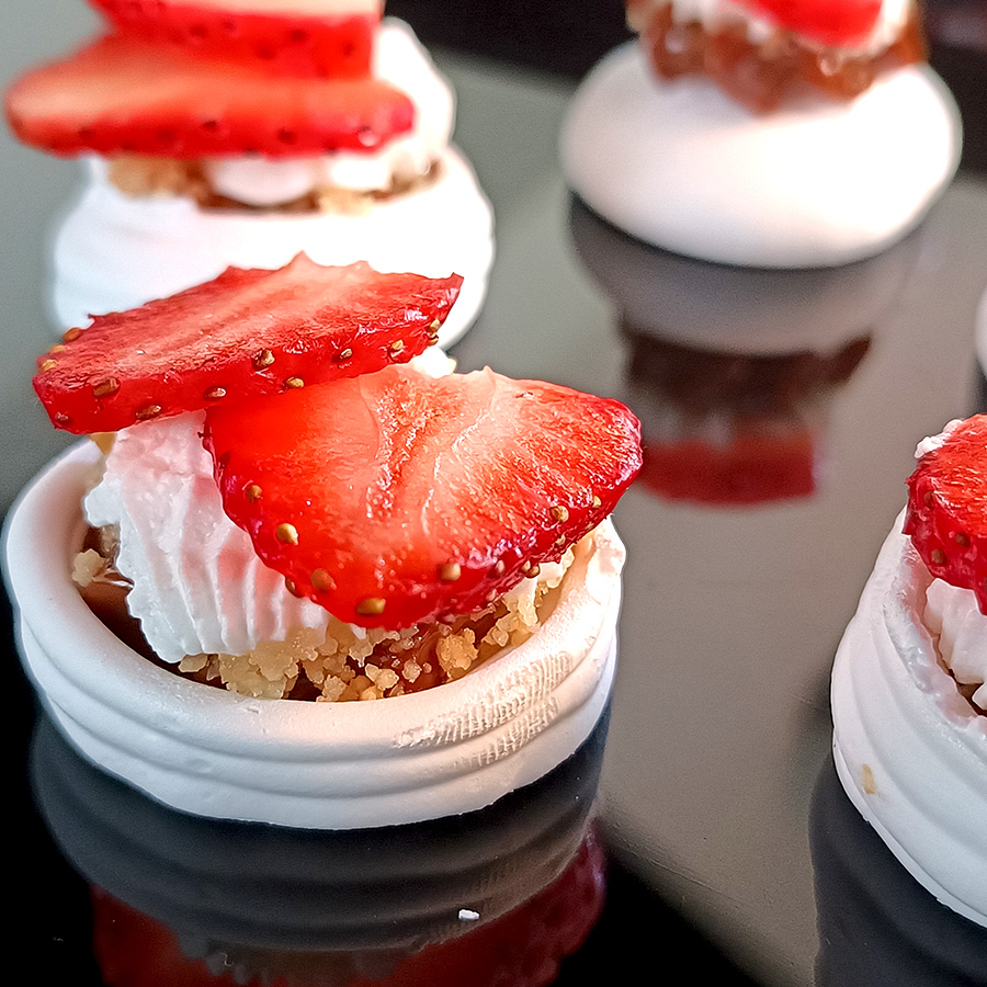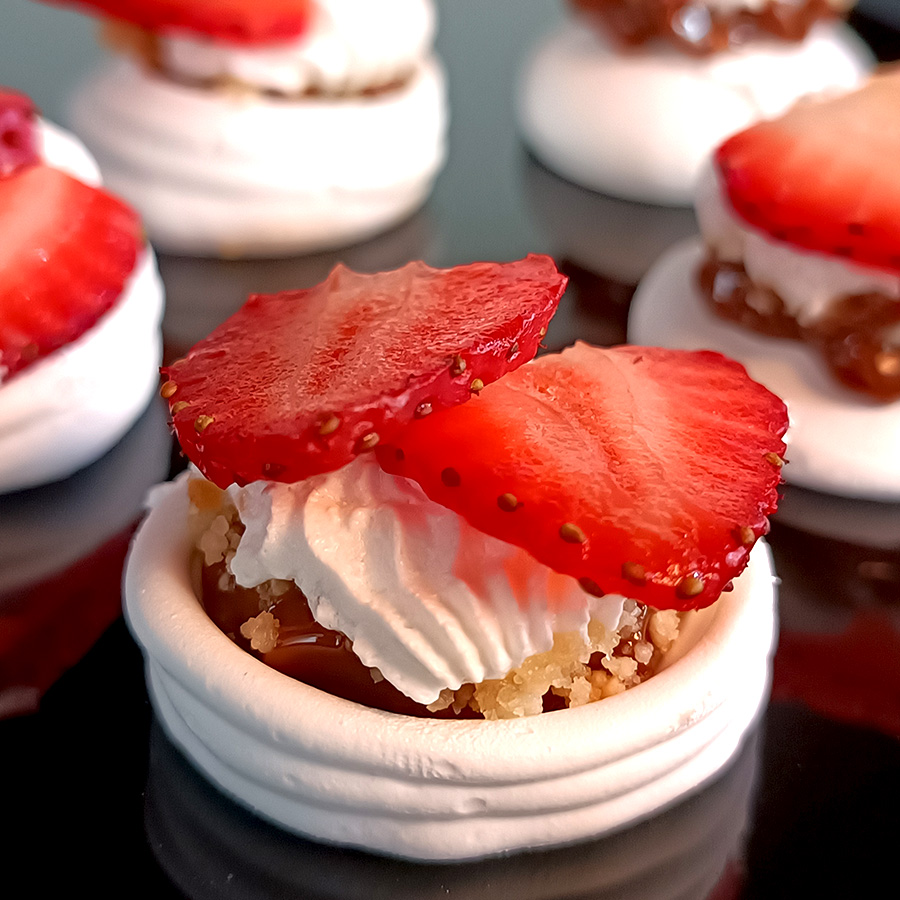 Interpretamos la receta tradicional con una cesta de merengue rellena de arequipe, lluvia de almendras y fresas frescas.