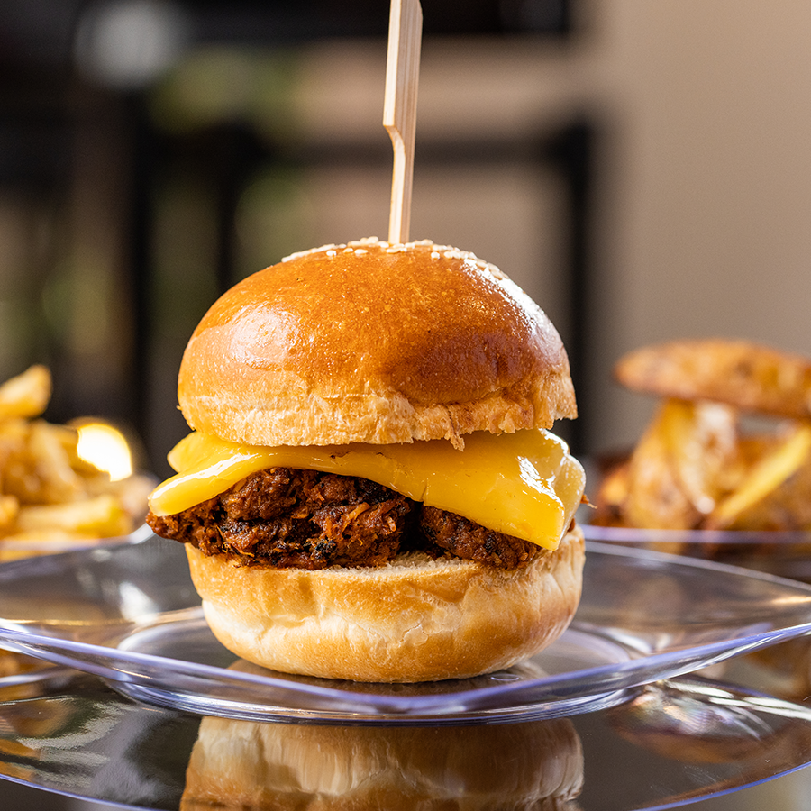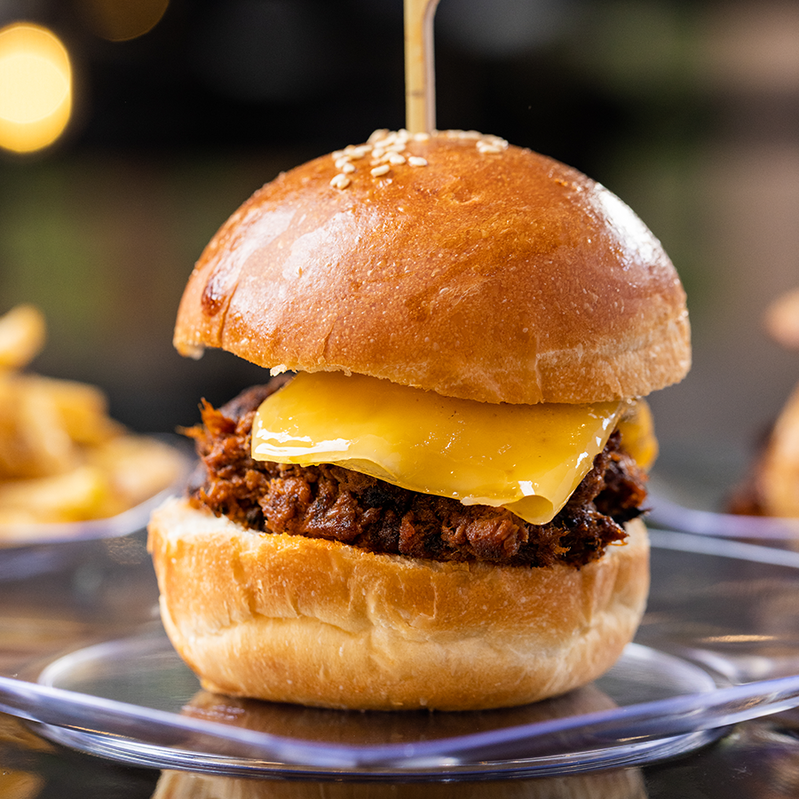 Pan brioche artesanal decorado con ajonjolí, nuestro fabuloso pulled pork al estilo sureño, queso, mostaza intensa y papas rústicas o fritas.