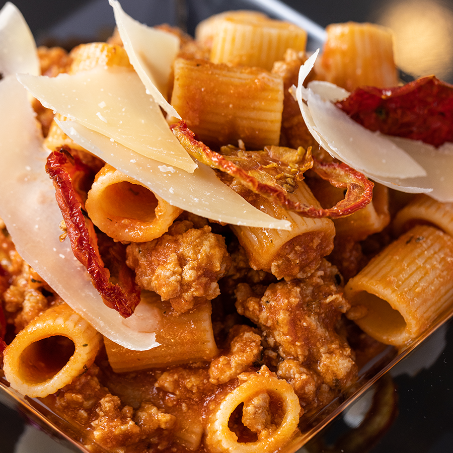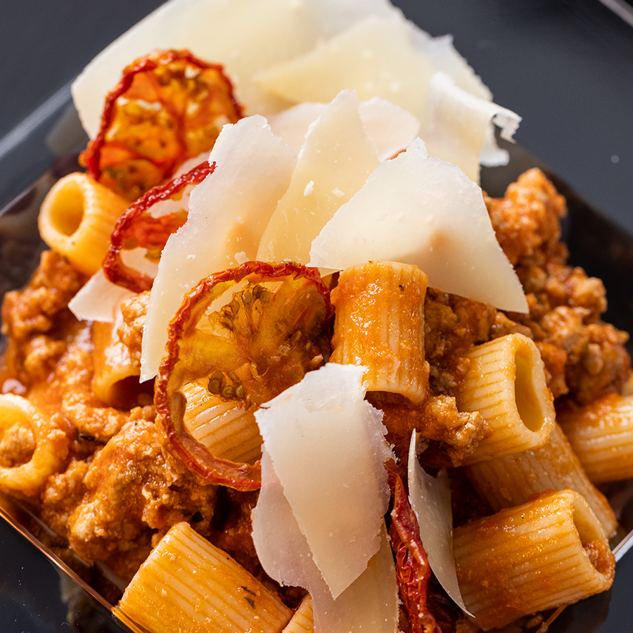 Rigatoni italiano con ragù de cerdo al hinojo, queso parmesano, centros de cebolla y tomates secos. Una explosión que te lleva directo al corazón de Italia.
