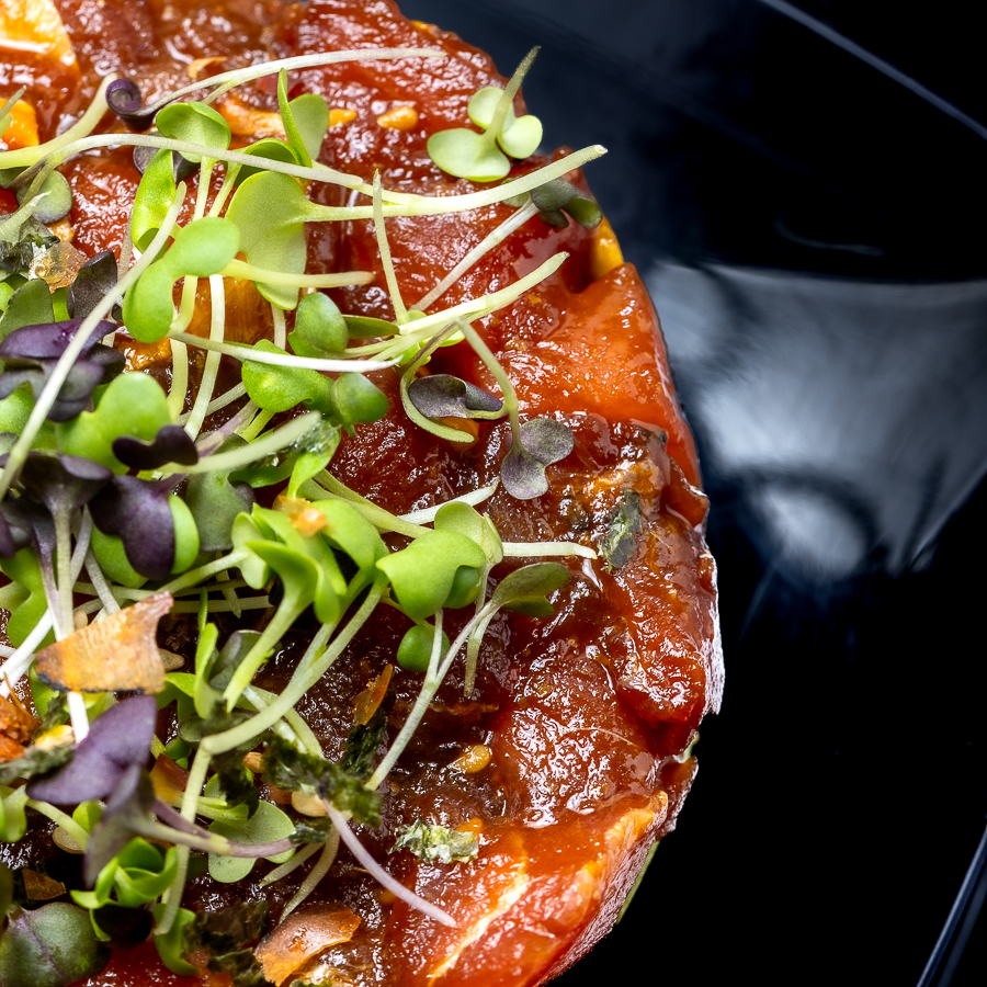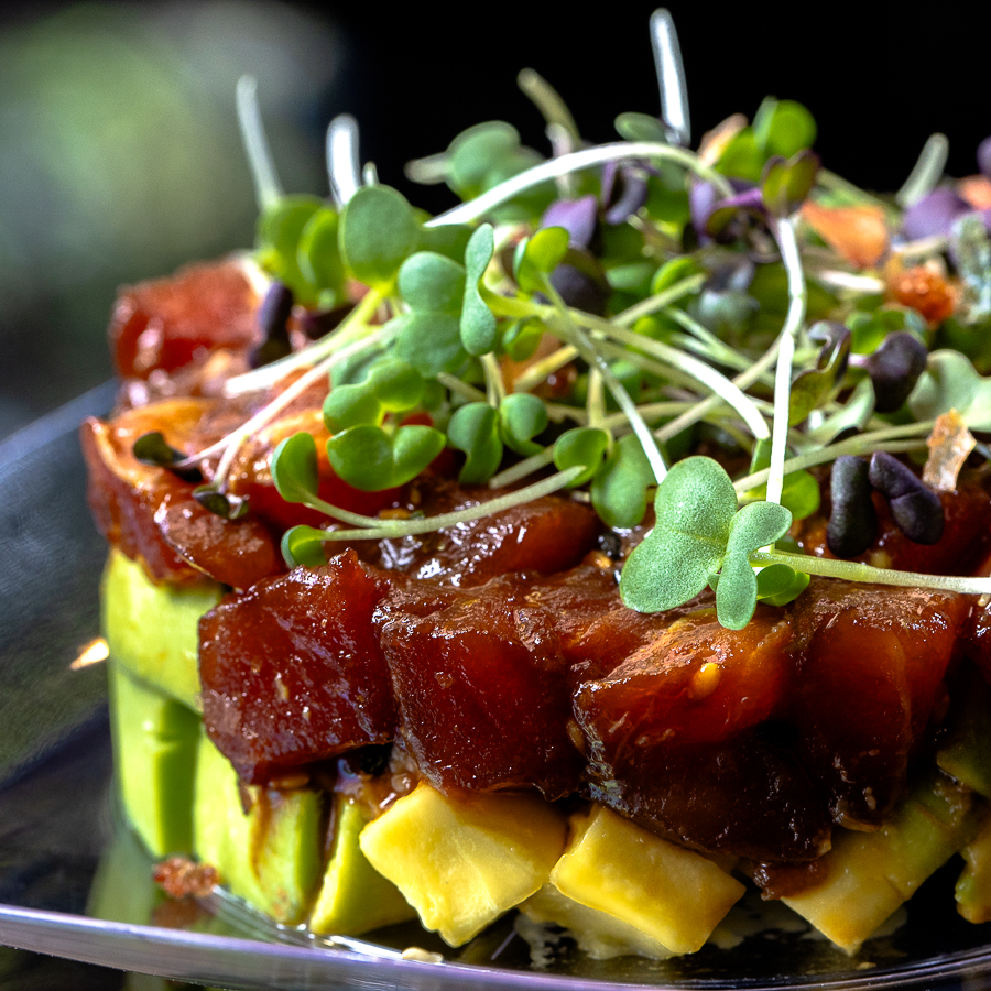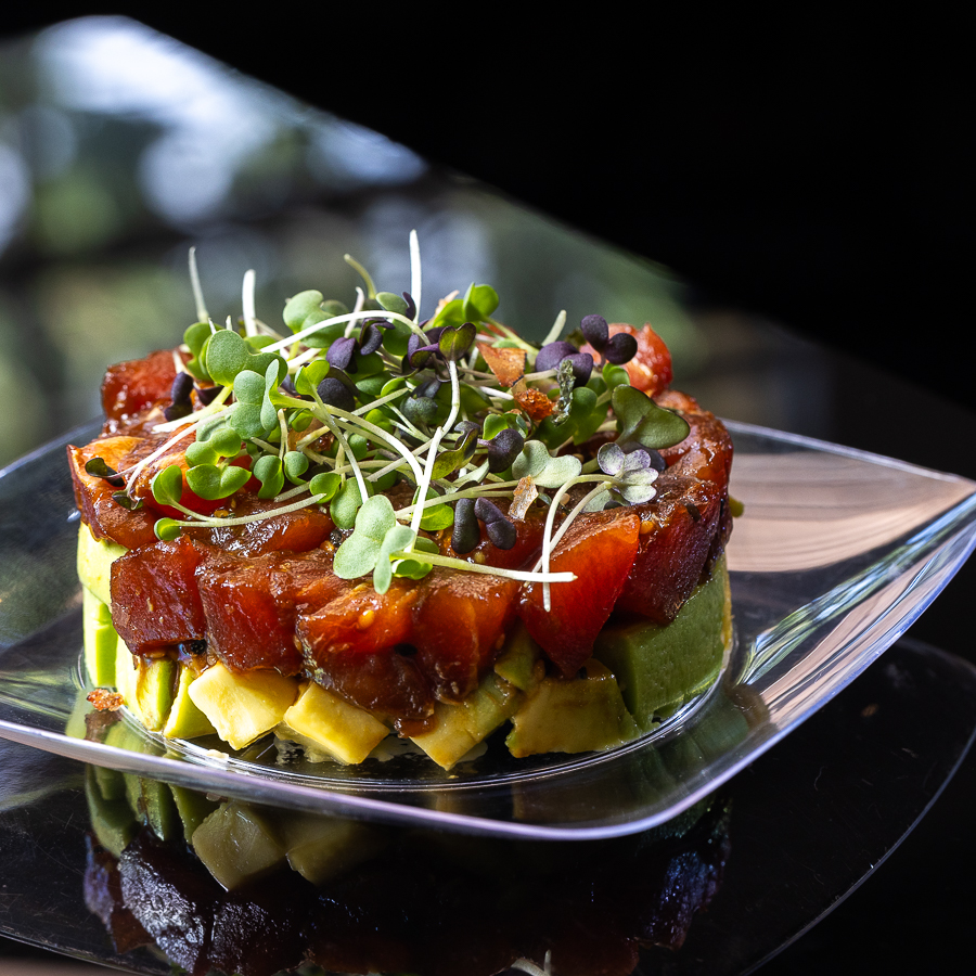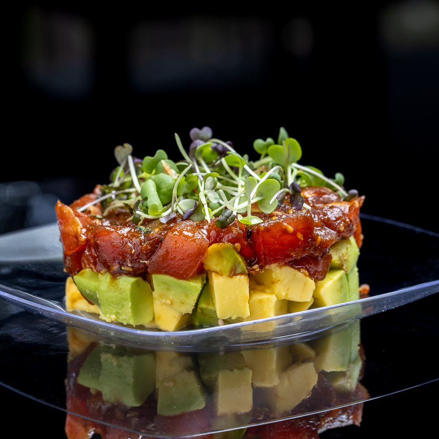 Cubos de atún frescos marinados en sésamo y jengibre, servidos sobre una cama de aguacate y brotes. Una combinación refrescante, elegante y explosiva.