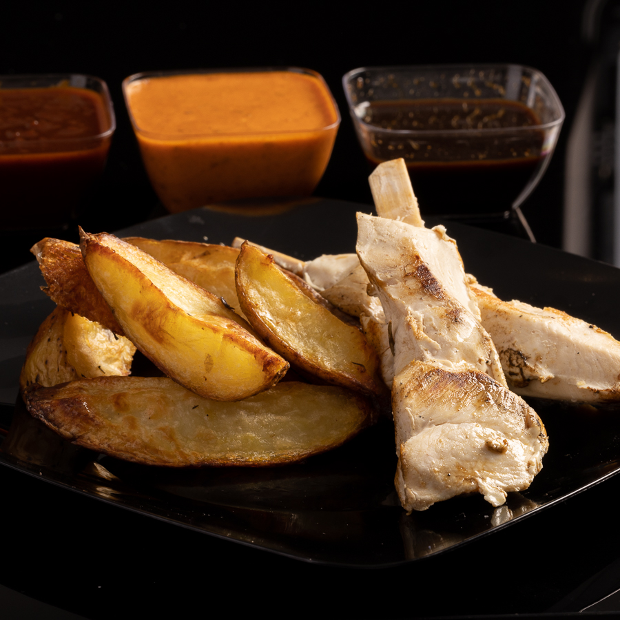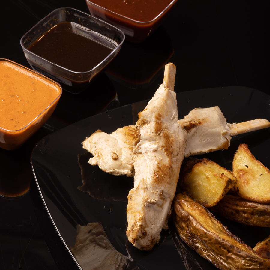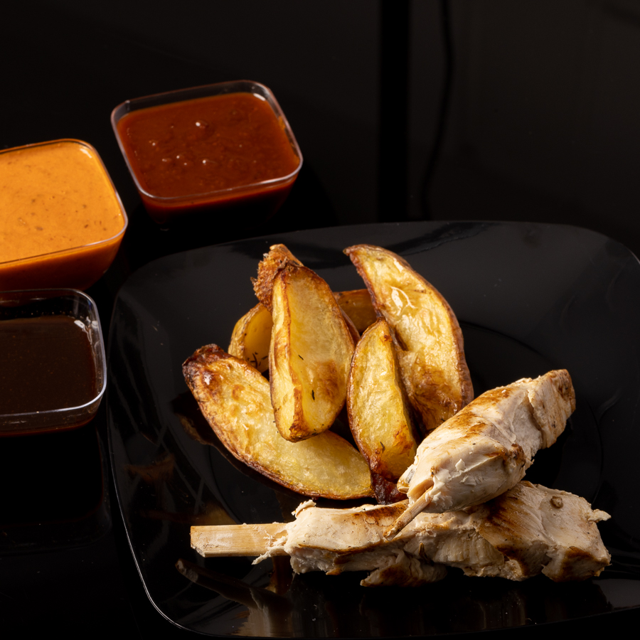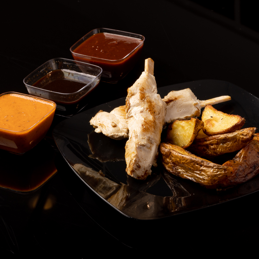 Jugosas brochetas de pollo 200 grs con nuestras exclusivas salsas buffalo (hot), hawaiian (medium), peach whisky (mild). Acompañado de papas rústicas.