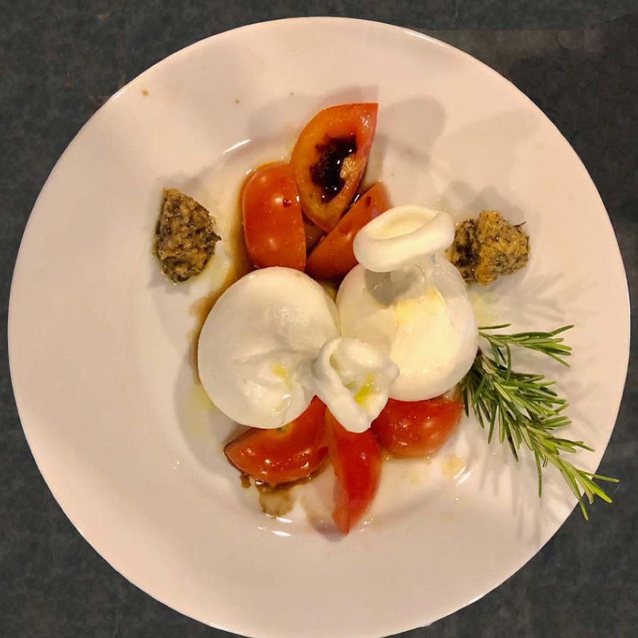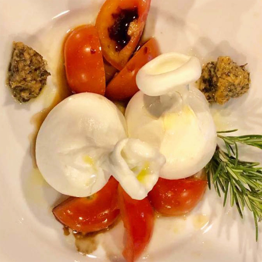 2 bombas gigantes de burrata de bufala, acompañada de tomates cherry, balsámico de frambuesa, crema de ajos rostizados y aceite de oliva