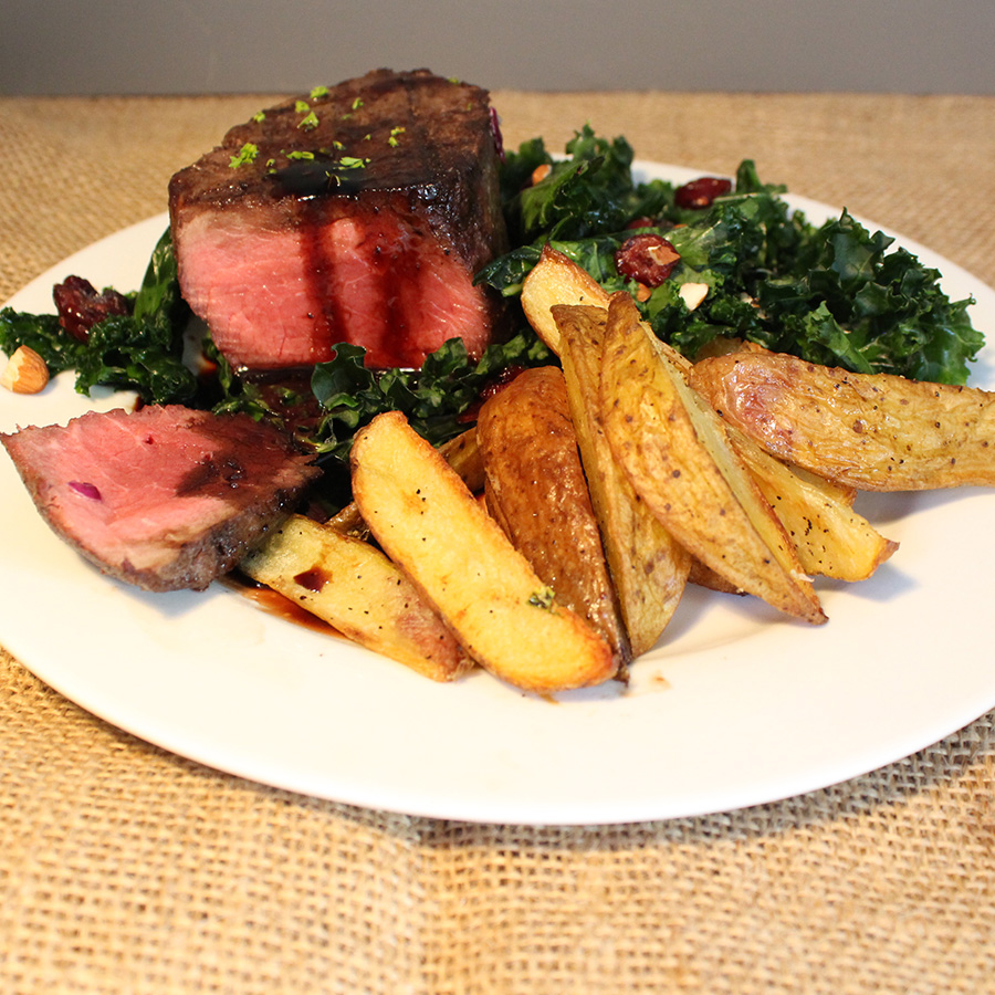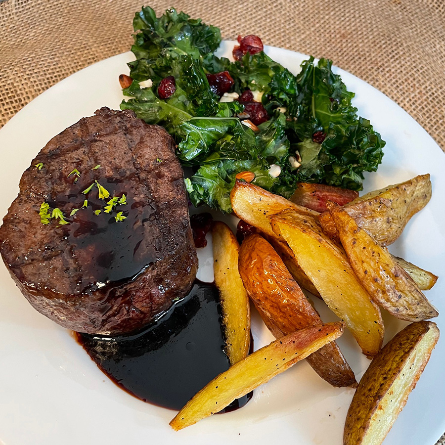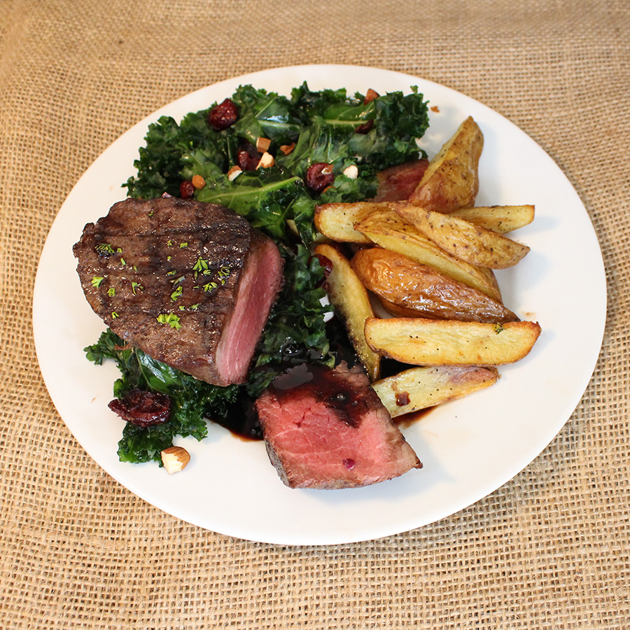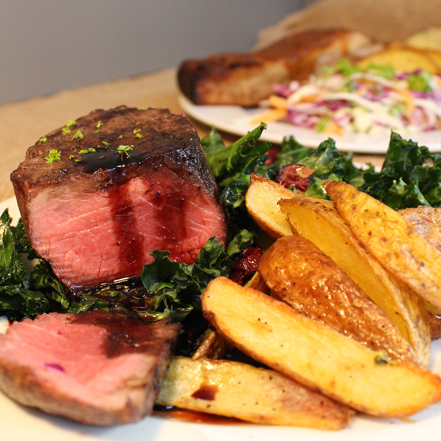 Centro de lomito de 250 grs. Acompañado de papas rústicas y dos salsas a elegir: Balsámico Frambuesas, Mostaza Champaña, Higos y Cebollas Vidalia. Ensalada de Kale y Cranberries con queso de cabra y nuestra vinagreta.