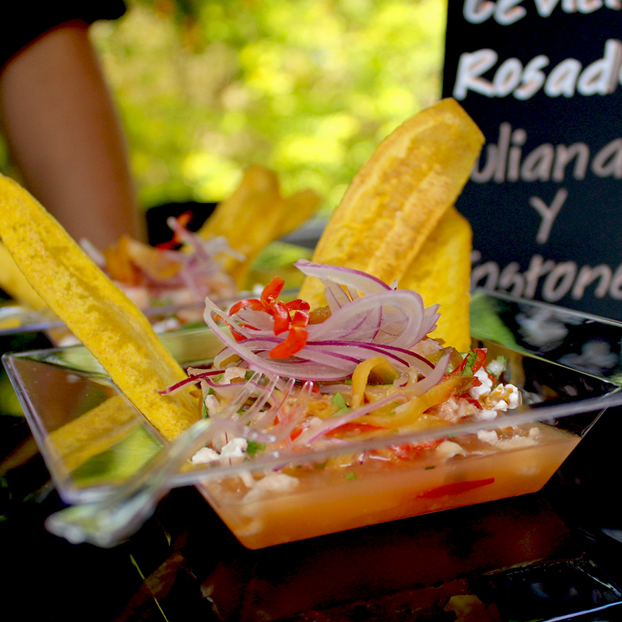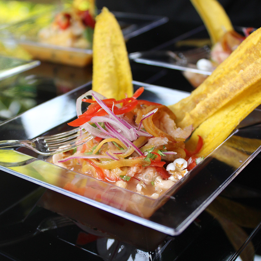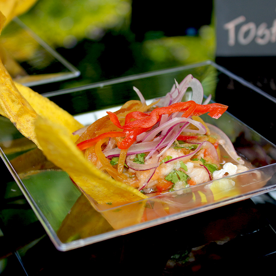 Ceviche para compartir de 300 grs. de pargo rojo (premium), julianas de mango, ají dulce y cebollas moradas, leche de tigre rosada, chips de plátano y cotufas