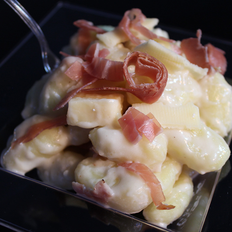 350 grs. de ñoquis cremosos en salsa de queso Asiago italiano, un queso sorpresa y rollitos de prosciutto italiano. Un plato completo que nunnca falla.