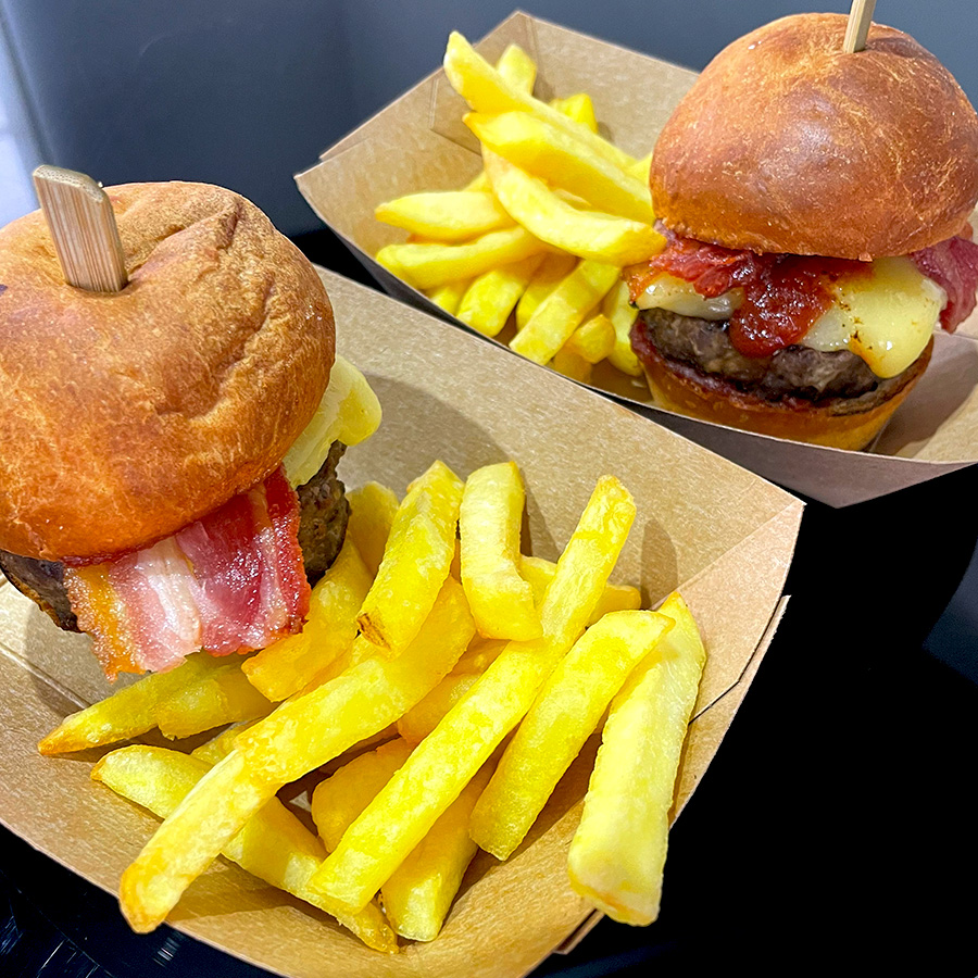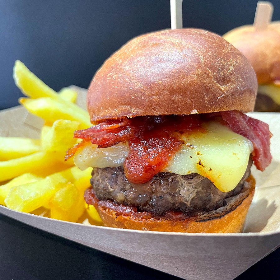 Pan brioche, queso, ketchúp, mayonesa y papas.