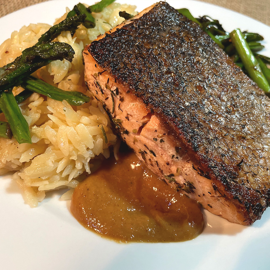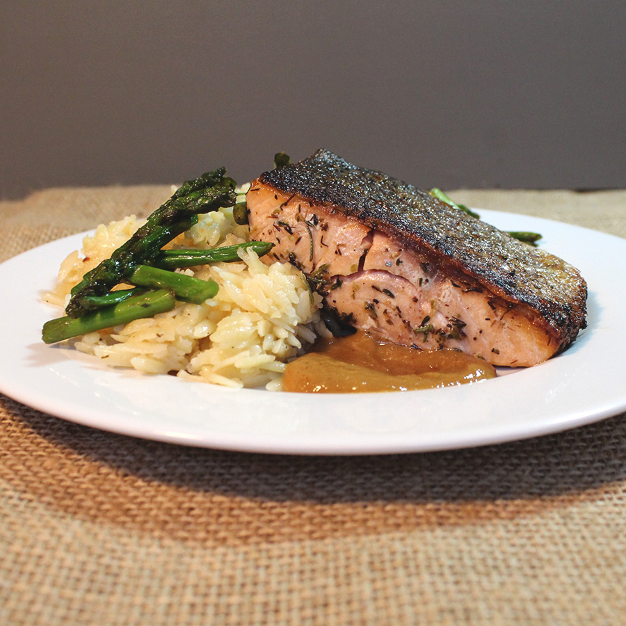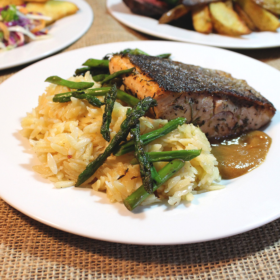 Churrasco de Salmón de 200 grs, sobre nuestra pasta de orzo orgánica en crema de parmesano reggiano y puntas de espárragos al grill con mostaza de champaña.